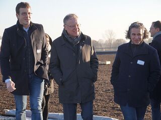 Auf dem neuen Warenlager in konsequenter Holzbauweise ist ein von der Europäischen Union und dem Land Niedersachsen gefördertes 10.200 Quadratmeter großes Biodiversitäts-Gründach in Kooperation mit der Hochschule Osnabrück entstanden, Substrat und Einsaat warten auf den Frühling mit Sonne und Regen, damit das Gründach wachsen kann. „Mir gefällt Ihre Verantwortlichkeit so gut“, das hätte mit Tradition und Einstellung zu tun, meinte Weil. Das Wort Biodiversitätsdach sei schwer, aber „Jetzt macht es mir richtig Spaß, es nochmal auszusprechen“ sein Humor. Beim Rundgang auf dem fertiggestellten Dach, einer neuartigen Anlage multifunktionaler extensiver Dachbegrünung mit unterschiedlichen Zonen und verschiedenen Saatmischungen unter den strengen Augen der Wissenschaftler und ihrem Forschungsprojekt, gab Weil zu: „In Hannover kenne ich diese Größenordnung noch nicht." Seine Staatssekretärin Anke Pörksen war sichtlich begeistert und regte an „Wir schicken Ihnen sicher auch noch jemanden von der Europäischen Fraktion zu Besuch.“