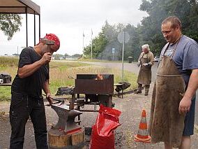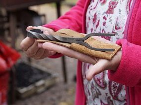 Ein Schmiedemobil hatte der Schmied dabei: Feld-Esse, Amboss, Steinkohle, Lederblasebalg und Eisen. Bei Bernard bekommt jeder Schutzbrille, Lederschürze, Zange und Handschuhe. Am Ende der Lehrstunde ist eine Gabel mit gedrehtem Griff und Haken zum Aufhängen entstanden. Das passende Futteral haben die Teilnehmer bei Dr. Behnke handgenäht und hängt jetzt am Gürtel.